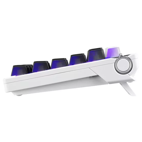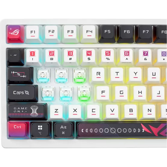 A ROG Azoth X egy 75%-os egyedi gamer billentyűzet, amelyet azoknak a felhasználóknak terveztünk, akik precizitást és sokoldalúságot követelnek meg. Hot-swappable, ROG NX V2 mechanikus kapcsolókkal rendelkezik, és szublimált, csillagos témájú ROG keycap-ekkel van ellátva a nagyobb tartósság és esztétika érdekében. A délre néző nyomtatott áramköri lap (PCB) széles körű kompatibilitást biztosít különböző kapcsolókkal és keycap-ekkel, míg az öt ütéscsillapító réteg, a tömítéses rögzítés és az FR4 pozícionáló lemez együtt finomított gépelési élményt nyújtanak. Az Azoth X OLED kijelzővel és intuitív vezérléssel rendelkezik, három üzemmódú kapcsolódással, beleértve a 2,4 GHz-es ROG SpeedNova technológiát, szilikon csuklótámasszal, három dönthető szöggel, valamint Mac támogatással.
