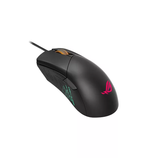 Klasszikus, aszimmetrikus gamer egér speciális hangolású 26 ezer dpi-s érzékelővel (1%-os eltéréssel), egy gombnyomásos működtetés, exkluzív „Push-Fit Switch Socket II” kapcsolófoglalattal, lézergravírozott ROG mintával, ROG Omni egérlábbal, ROG Paracord vezetékkel és Aura Sync RGB megvilágítással