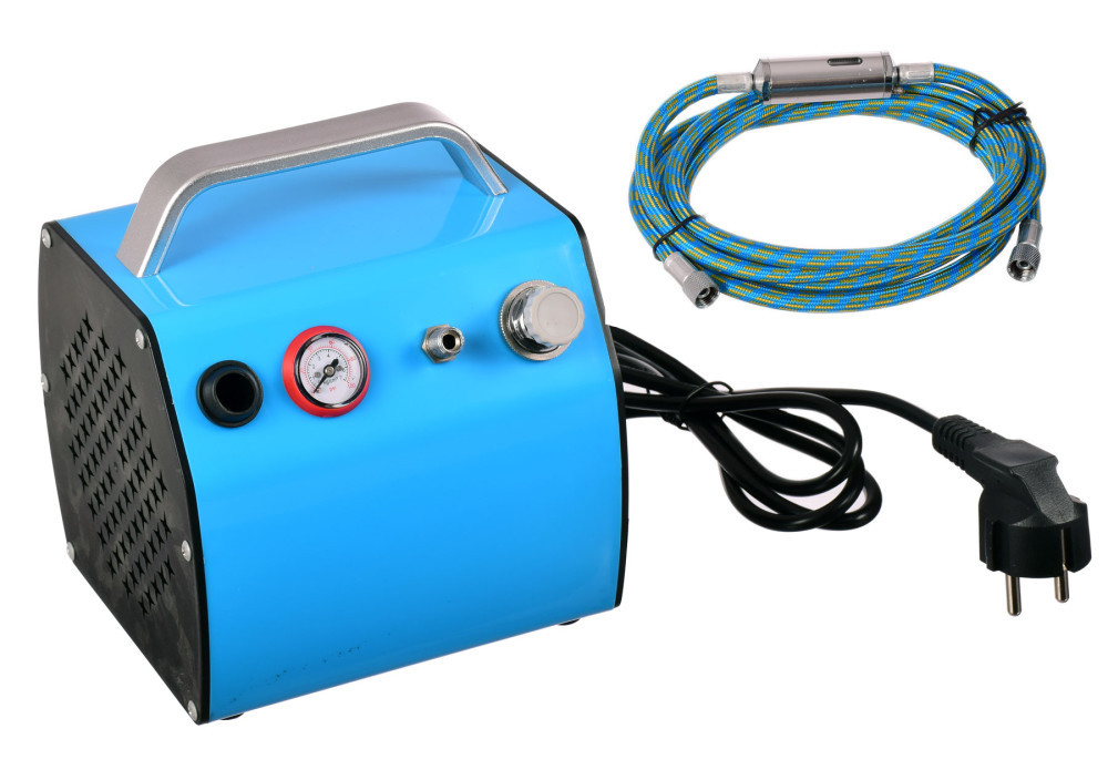 Masszív és hatékony airbrush kompresszor kis méretekkel, 165x165x180mm. Szűkítővel és nyomásmérővel felszerelt , amely lehetővé teszi az üzemi nyomás szabályozását.