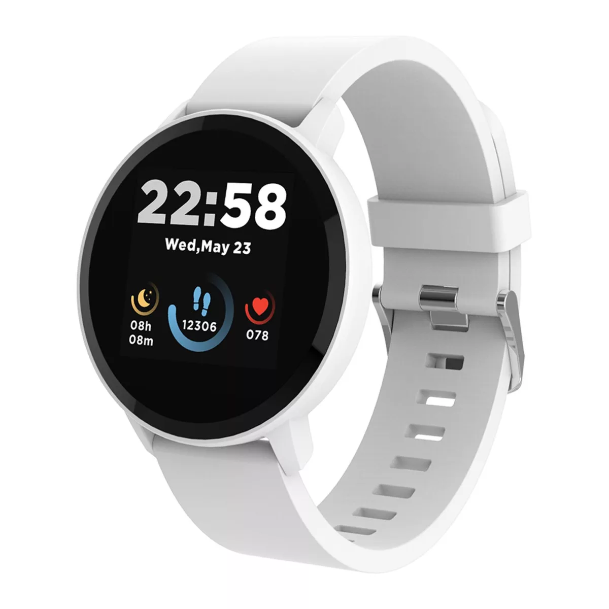 Az óra 1,3”-os IPS kijelzője éles és színgazdag megjelenítést biztosít, amely minden fényviszony mellett jól olvasható. A 240 x 240 pixeles felbontás részletgazdag képet nyújt, míg a fehér szilikon pánt és könnyű műanyag ház kényelmes viseletet garantál egész napra. A mindössze 35 grammos súly szinte észrevétlenül simul a csuklóra.