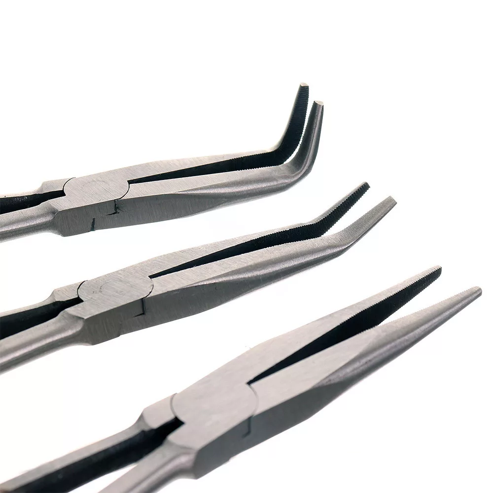 Fogókészlet, hosszú - JC1011 Műhelyfogó finom hegyekkel, 0, 45 és 90 fokban hajlítva. Nélkülözhetetlen a garázsokban és az autószervizben. Kiváló minőségű szerszámacélból készült, a fogantyú csúszásmentes réteggel van borítva. Az egészet egy kényelmes rongytokba helyezik. Műszaki adatok: Hossz: 275mm, Fogó hajlítási szöge: egyenes, 45, 90 fok.
