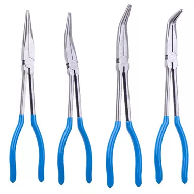 Hosszú fogó készlet 280mm TECHNIC DN-H1116 Hosszú fogó készlet 280mm. A CrV szerszámacélból készült fogantyú tartós műanyagból készül, amelyet csúszásmentes gumiréteg borít, ami biztosítja a biztonságos fogást. A készlet négy különböző típusú fogót tartalmaz: 90°-os ferde fogó 45°-os ferde fogó 20°-ban hajlított fogó egyenes fogó Tároló doboz