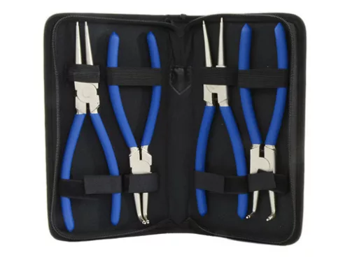 Seeger fogó 225mm külső és belső gyűrűkhöz - JC1012-225 A készlet tartalma: Seeger fogó belül és kívül hajlítva Seeger fogó egyenesen belül és kívül Fedél zárral Kiváló minőségű, 225 mm hosszú SEEGERA fogókészlet erős acélból. A fogantyút gumi szigetelő réteg borítja, biztonságos fogást biztosítanak. A fogó ideális professzionális műhelyek és barkácsolás szerelmesei számára. Tasak erős anyagból Műszaki adatok: Fogó hegye: 90°C-kal hajlítva. Fogó hegye: egyenes Fogó teljes hossza: 225mm