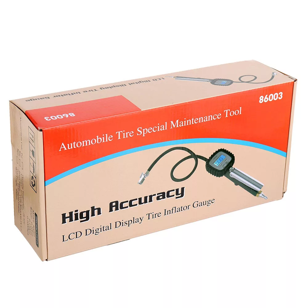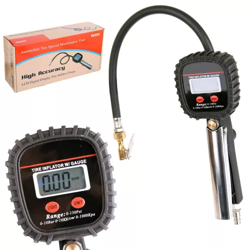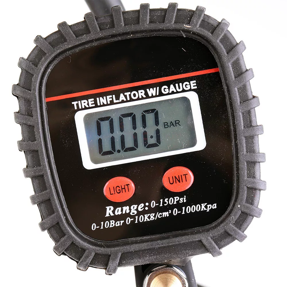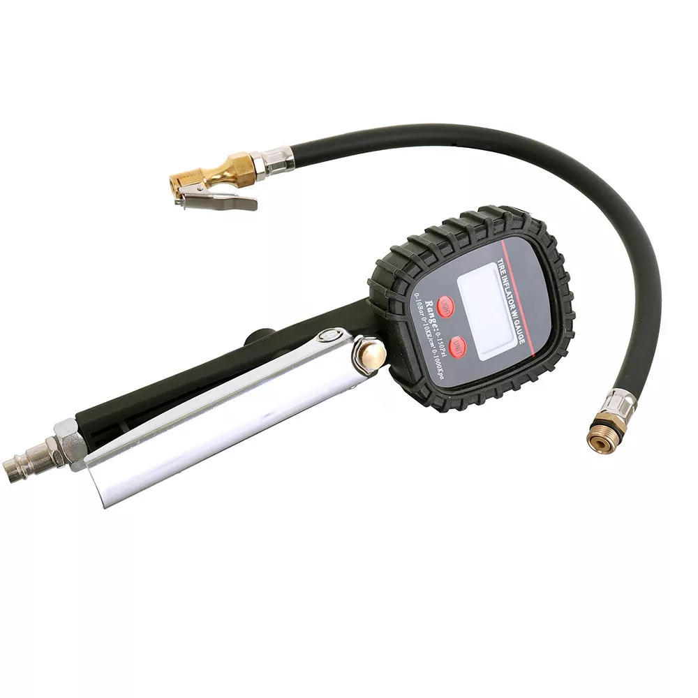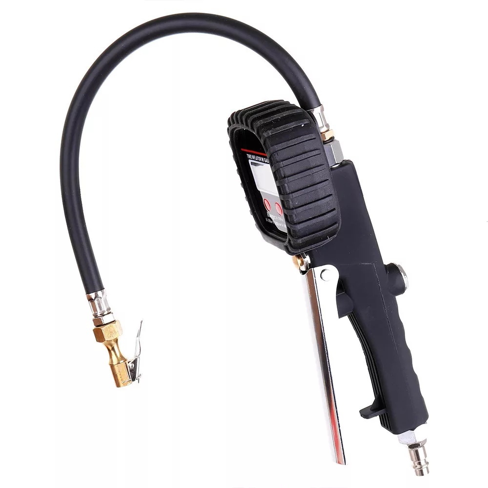 Átlátszó digitális kijelzővel felszerelt gumiabroncs-felfújó pisztoly. A digitális nyomásmérő nagyobb tartósságot és kényelmet biztosít, mint az analóg változat.