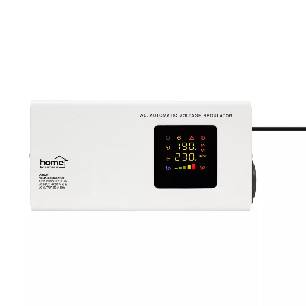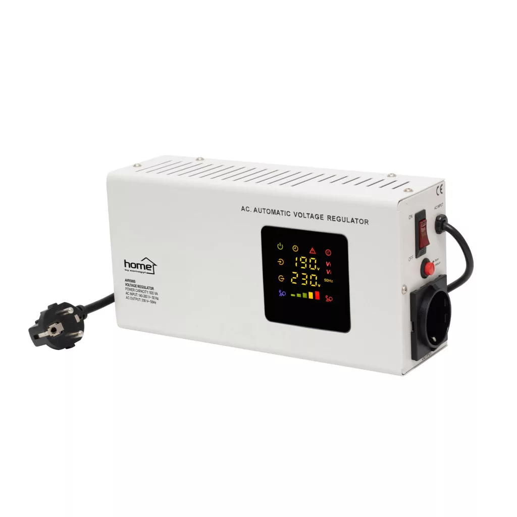 HOME AVR500S feszültségstabilizátor, 500VA, automatikus működés, vékony kivitel, falra szerelhető, színes digitális kijelző, teljeskörű meghibásodás elleni védelem