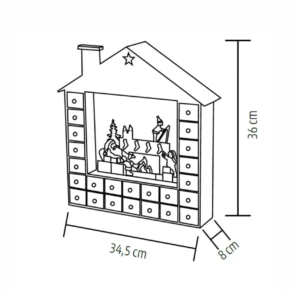A 34,5 × 8 × 36 cm-es méret ideális a polcra, komódra vagy asztalra helyezve, anélkül hogy sok helyet foglalna. A LED világítás 2 db AA elemmel működik (az elemek nem tartozékok), így a naptár bárhol könnyen elhelyezhető – nincs szükség konnektorra vagy kábelekre. Az elemes tápellátásnak köszönhetően biztonságos és mobilis használatot biztosít, különösen kisgyermekes otthonokban.