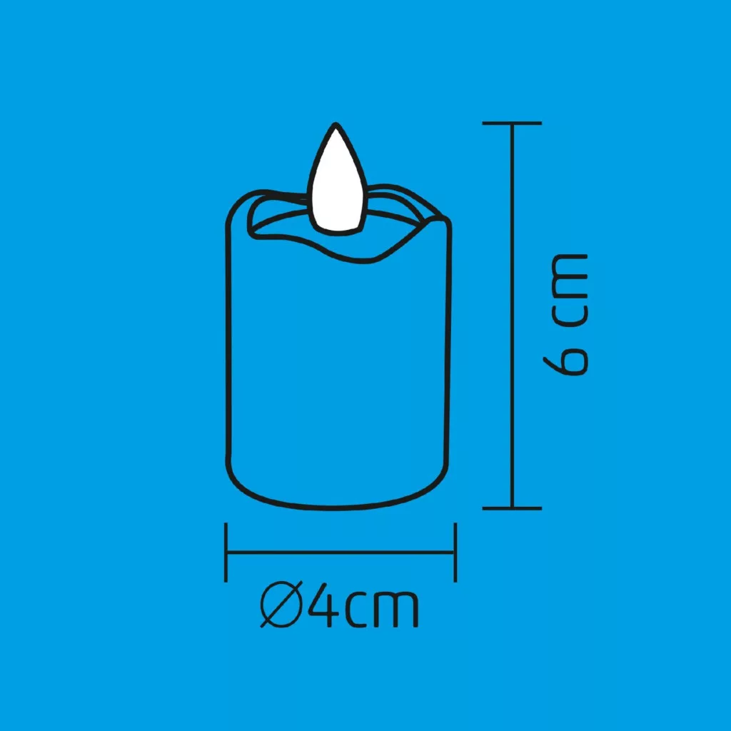 Ez a kompakt gyertyaszett sárga, pislákoló LED-del működik, amely valósághűen utánozza a valódi gyertyák melegségét. A gyertyák átmérője 4 cm, magasságuk pedig 6 cm, így ideális méretűek asztali dekorációnak vagy polcokra helyezve. A tápellátásról egy 3 V-os CR2032 gombelem gondoskodik (a csomag tartalmazza), így azonnal használatra kész. Egy displayben nyolc szett található, így több darabot is egyszerűen beszerezhet különböző helyiségek dekorálására.