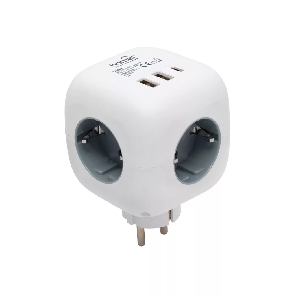 Home CUBE1 kocka elosztó USB töltővel, 3 aljzat gyermekvédelemmel, 1db USB C, 2db USB A, max. 3680 W