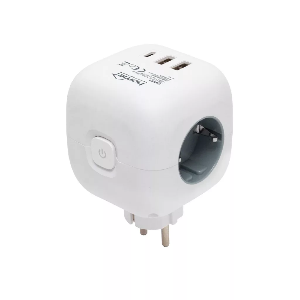 Home CUBE1 kocka elosztó USB töltővel, 3 aljzat gyermekvédelemmel, 1db USB C, 2db  USB A, max. 3680 W