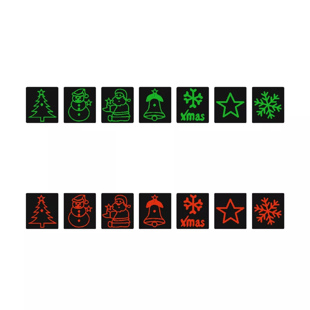 8-féle automatikusan isméttlődő karácsonyi fény-effekt • folyamatos piros és zöld lézerfény • vetítési távolság 10 m • vetített felület 200 mm2