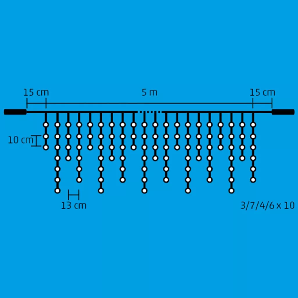 Ez a 5 méteres fényfüggöny 200 hidegfehér LED-del rendelkezik, amelyek gyönyörű, tiszta fényt biztosítanak, ezzel varázsolva egyedi hangulatot bármely környezetbe. Az állófényű LED-ek egyenletesen oszlanak el a 3/7/4/6 füzérekből álló, 10 csoportos rendszerben, amely látványos, mégis harmonikus megjelenést eredményez. A fehér vezeték kiválóan illeszkedik a különféle környezetekbe, legyen szó beltéri karácsonyi díszítésről vagy kültéri fénydekorációról.