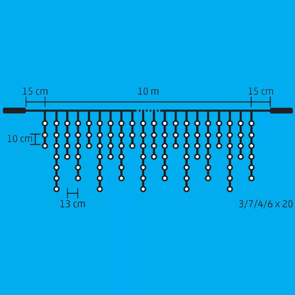 Ez a 10 méteres hosszúságú fényfüggöny 400 db melegfehér LED-del világít, amelyek meghitt, melegséget árasztanak. A fényfüzérek különlegessége, hogy minden második füzérben hidegfehér LED-ek is villognak, így sziporkázó, dinamikus hatást keltenek, amely különleges hangulatot teremt. A fényfüggöny kül- és beltéri kivitelű, így akár az udvar, akár a nappali ékessége lehet. A 3/7/4/6 elosztású füzérek 20 csoportban helyezkednek el, így egyenletesen oszlanak el a fények, és igazán látványos dekorációt hoznak létre. A fehér vezeték szinte láthatatlan marad, így a figyelem teljes mértékben a sziporkázó fényekre irányul.