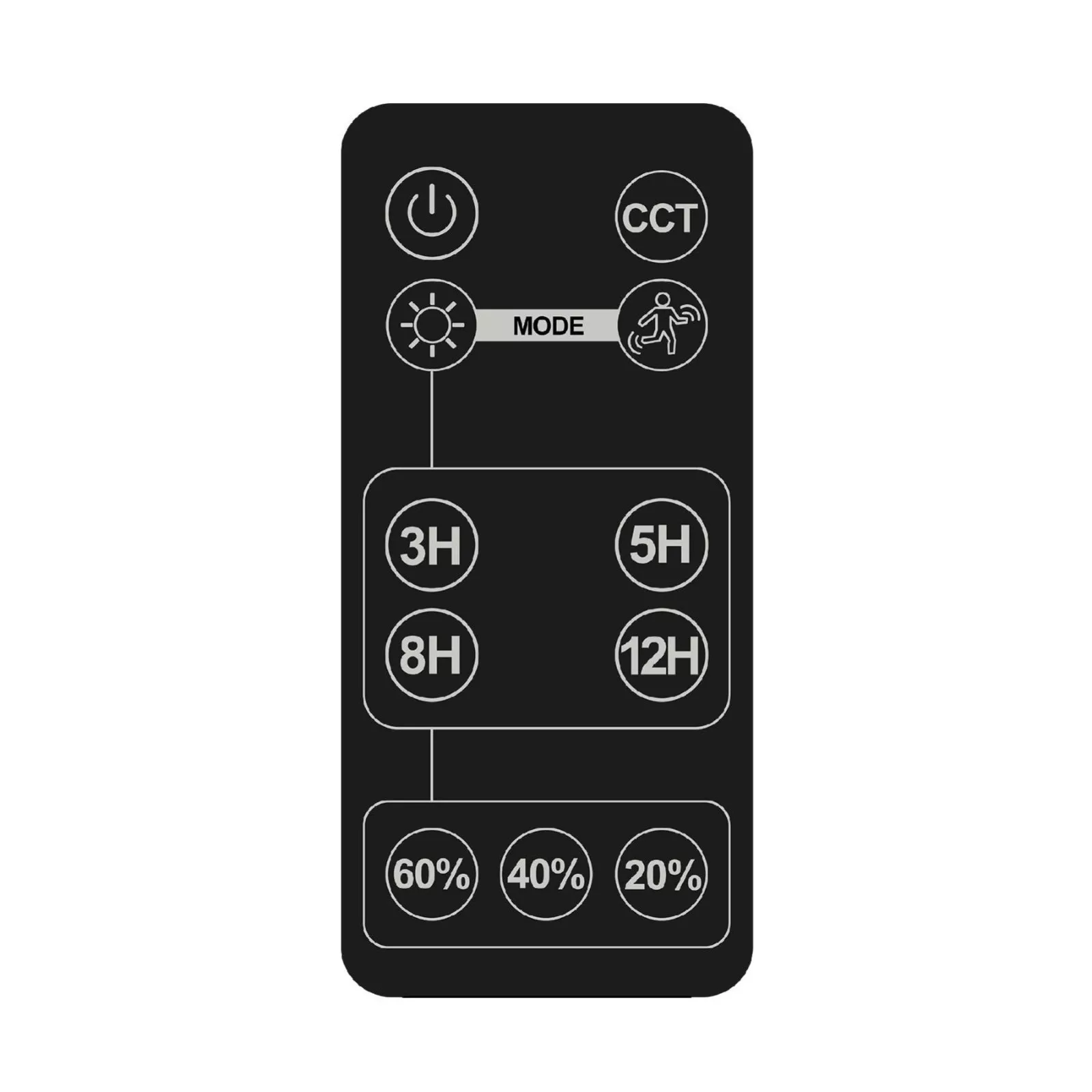 2 üzemmód: n1. folyamatos világítás alapértelmezett, vagy beállított fényerő és működési idő szerint, majd váltás szenzor módra • 2. szenzor mód (mozgás érzékelésekor 100% fényerő, majd 30 másodperc után 5% fényerővel világítás)
