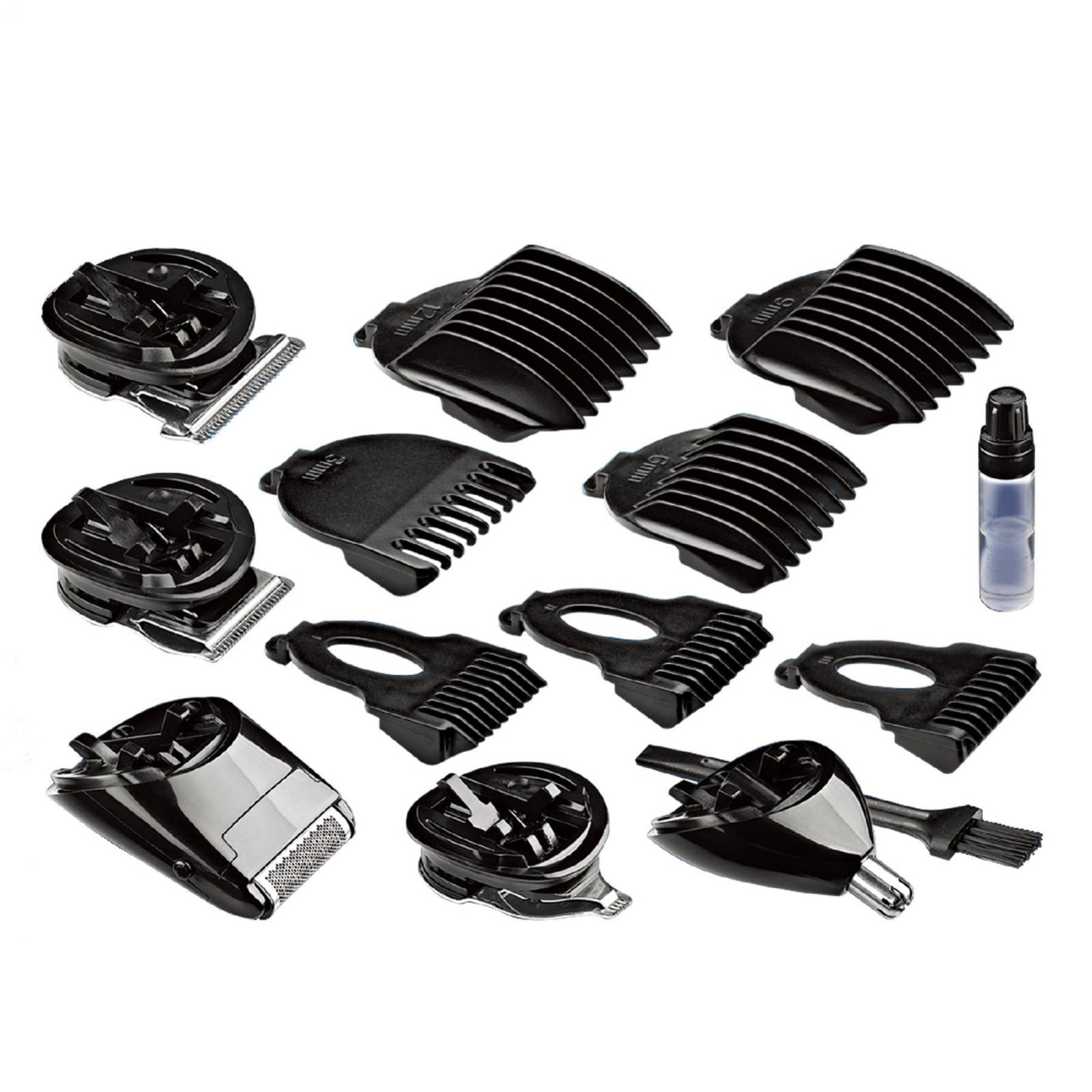 Ez a kiváló minőségű készlet 5 cserélhető fejet kínál: egy széles, egy normál, és egy precíziós vágófejet, továbbá orrszőrnyírót és borotvát. Ezen kívül 7 különböző műanyag fésűt is talál a csomagban, melyekkel a haját 3, 6, 9, 12 mm-es hosszúságúra, illetve a szakállát 4, 6, 8 mm-es hosszúságúra nyírhatja.