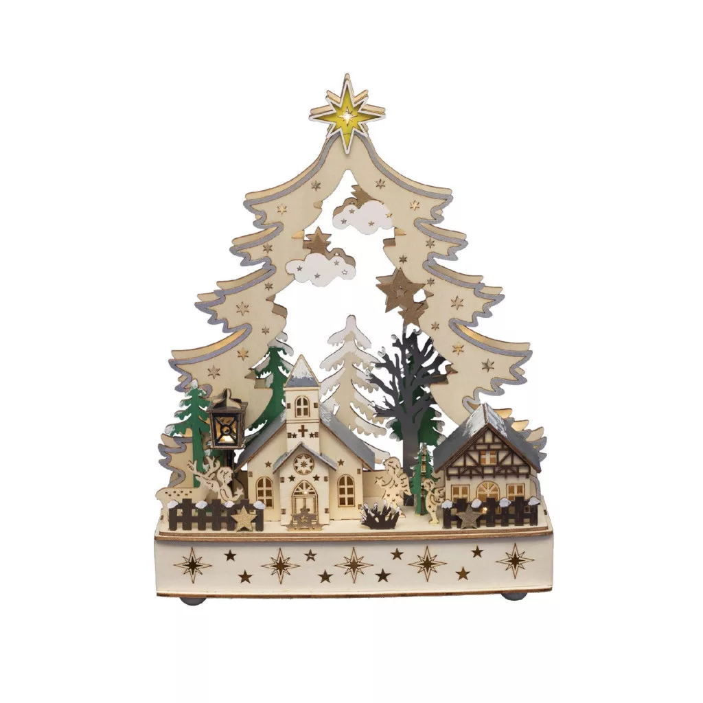 Home KAD26 karácsonyi falu asztali dísz, beltéri kivitel, 12 db melegfehér LED, lézerrel kivágott fa motívumok