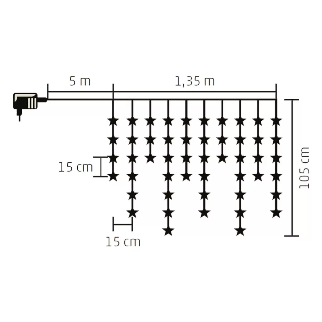 A fényfüggöny átlátszó vezetékkel rendelkezik, amely diszkréten simul bele bármilyen belső térbe, biztosítva, hogy a figyelem a csillagok ragyogására összpontosuljon. Az 5 méter hosszú tápvezeték és a mellékelt IP20 beltéri hálózati adapter lehetővé teszi a könnyű és rugalmas elhelyezést. A melegfehér fények kellemes, otthonos atmoszférát teremtenek, tökéletesen kiegészítve az ünnepi dekorációt.