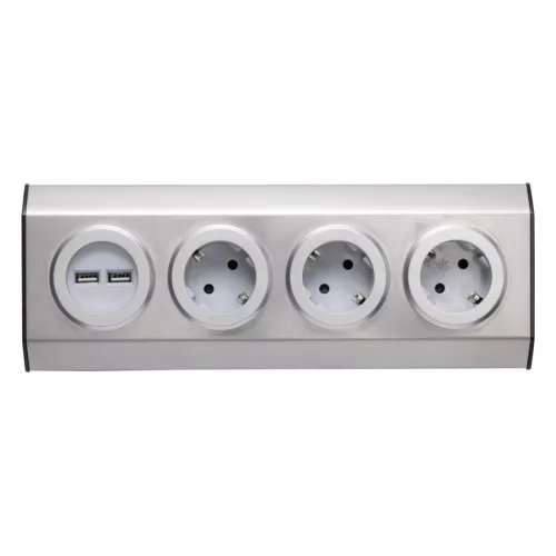 Home KNV 03/USB szerelhető konyhai hálózati elosztó USB aljzatokkal, 3 védőérintkezős és 2 USB aljzat, rozsdamentes acél, felszerelés sarokba is, max. 3680 W,