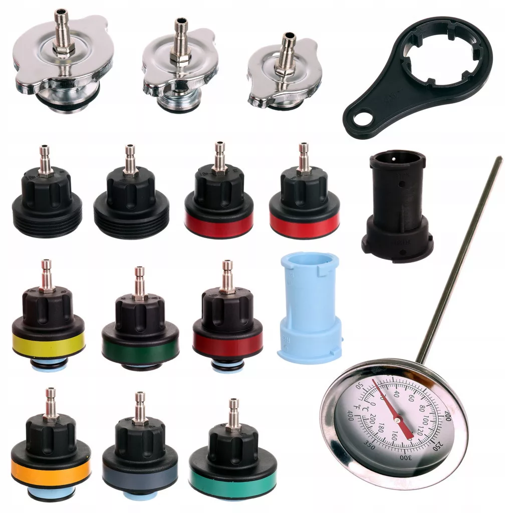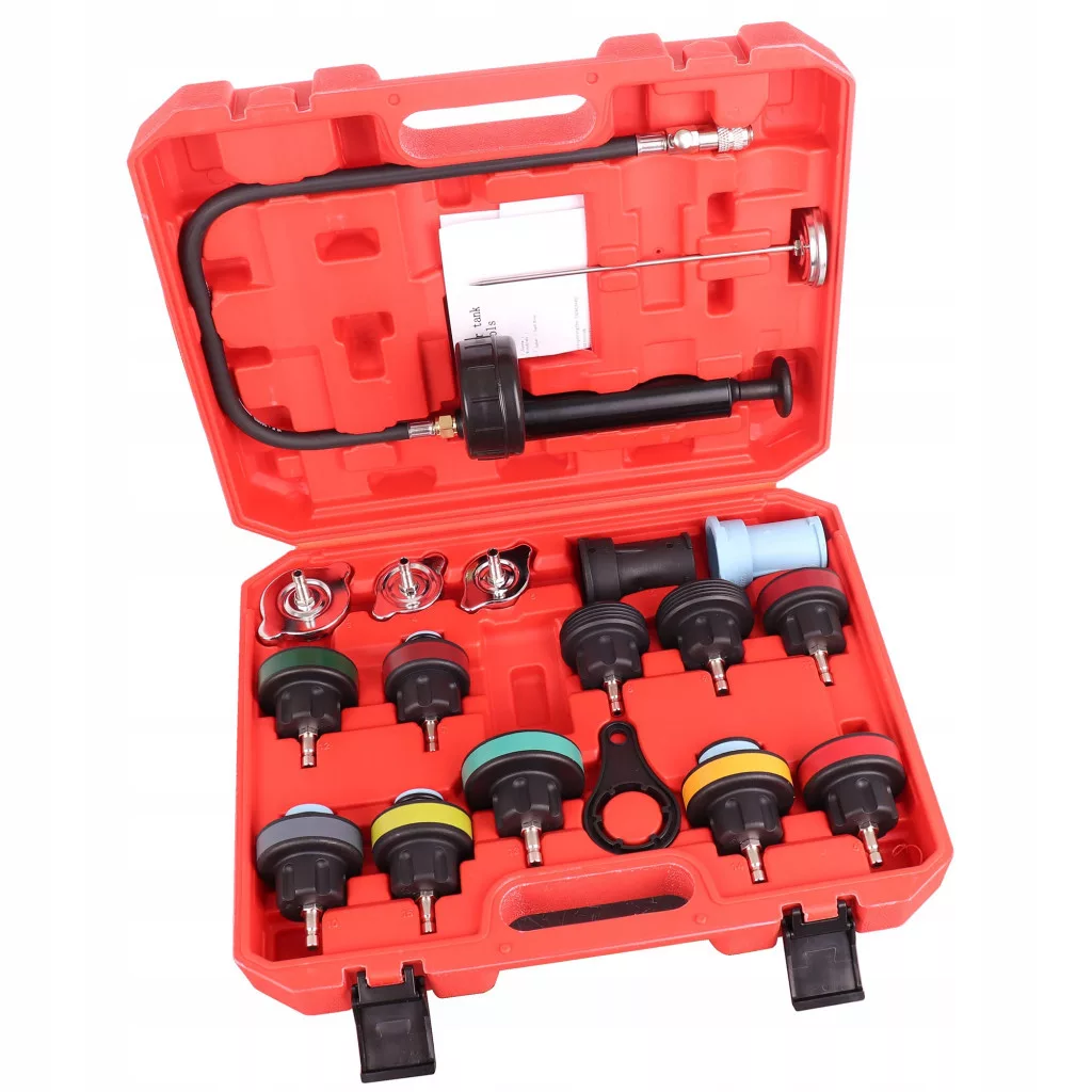 Professzionális hűtőfolyadék-rendszer és fűtésszivárgásvizsgáló. Alkalmas személygépkocsikhoz, furgonokhoz és teherautókhoz. Ezen kívül a készlet tartalmaz egy hosszú szárú hőmérőt, amely a hűtőbe illeszthető. Ez lehetővé teszi a termosztát hatékonyságának ellenőrzését. A készlet 12 darab, különböző típusú radiátorokhoz való kupakot tartalmaz, amelyek a szivattyúhoz gyorscsatlakozó rendszerrel csatlakoztathatók.