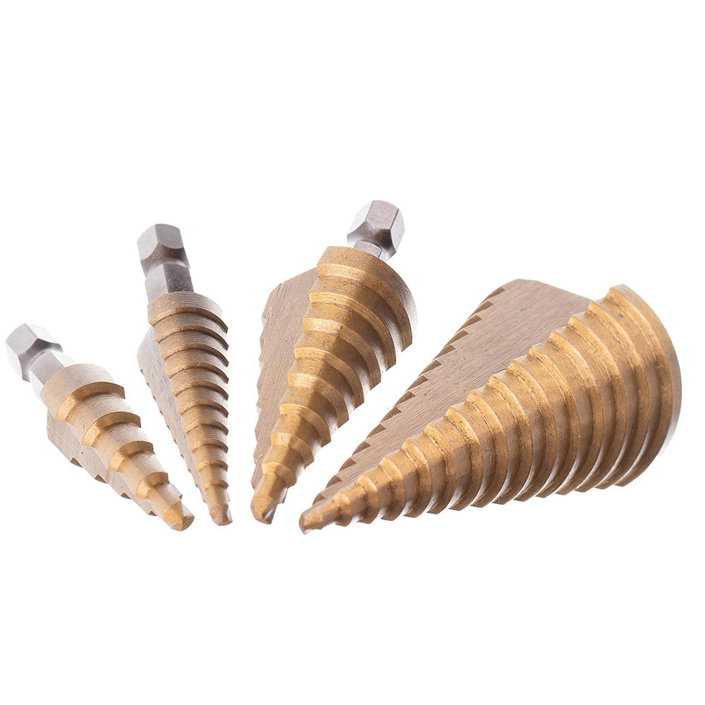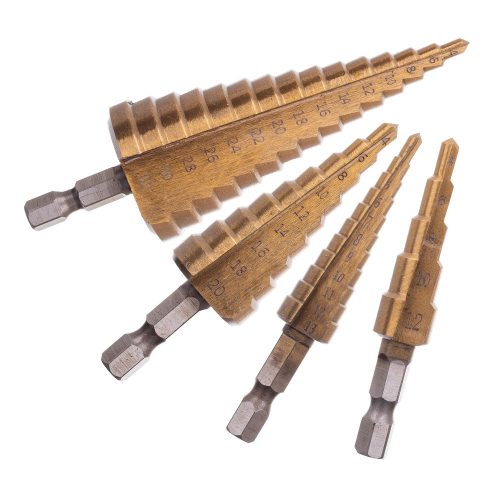 Ezek kiváló minőségű lépcsős kúpos fúrók, amelyek kiváló minőségű HSS gyorsacélból készülnek, és titán bevonattal vannak bevonva, ami meghosszabbítja élettartamukat. Kiválóan alkalmasak lyukak fúrására pl. PVC-be, vékonyfalú acéllemezekbe, műanyagokba stb.