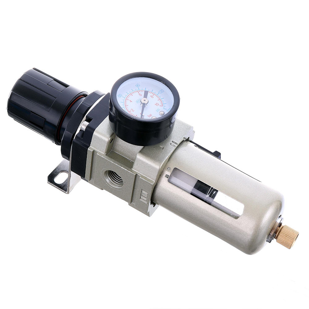 Légcsökkentő 1/4 hüvelykes szűrővel AW3000-02 kompresszorhoz - 20um A reduktor előnye a jó és tartós kialakítás, egy tiszta nyomásmérő, egy levehető akasztó, amelyet a reduktor falra csavarozására használnak, szabályozó zár (fel - le). 1/4" pneumatikus rendszerekben használják, és alapvető elem. A szűrőt a levegő párátlanítására használják. Ez minden pneumatikus rendszer alapvető eleme. A szűrő alkalmazásával többek között megakadályozhatja; szerszámok rozsdásodása, foltok szórópisztollyal történő festéskor, tömlők károsodása stb. Elválasztja az olajat és más szennyeződéseket is. A víz kiürítése magában foglalja a szűrő alján található szelep húzását. Műszaki adatok: Szűrőmagasság kb: 210 mm Szélesség: 55 mm Beállítási tartomány: 0,5–10 bar Menetek: 1/4" (12 mm) Maximális nyomás: 14,7 bar Maximális térfogatáram: 2000 l / perc Szűrés 0,02 mm Tartály térfogata: 20 ml Üzemi hőmérséklet: 60 ° C-ig
