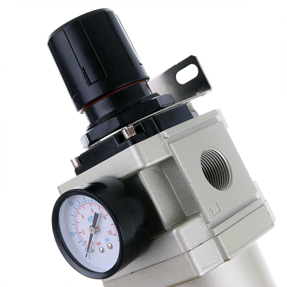 Légcsökkentő 3/4 hüvelykes szűrővel az AW5000-06 - 20um kompresszorhoz A reduktor előnye a jó és tartós kialakítás, egy tiszta nyomásmérő, egy levehető akasztó, amelyet a reduktor falra csavarozására használnak, a szabályozó zárja (fel - le). 3/4" pneumatikus rendszerekben használják, és alapvető elem. A szűrőt a levegő párátlanítására használják. Ez minden pneumatikus berendezés pótolhatatlan eleme. A szűrő alkalmazásával többek között megakadályozhatja; szerszámok rozsdásodása, foltok szórópisztollyal történő festéskor, tömlők károsodása stb. Elválasztja az olajat és más szennyeződéseket is. A víz kiürítése magában foglalja a szűrő alján található szelep húzását. Műszaki adatok: A készlet magassága kb.: 340 mm Szélesség: 95 mm Beállítási tartomány: 0,5–10 bar Menetek: 3/4" (kb. 24mm külső oldal) Maximális bemeneti nyomás: 14,7 bar Névleges teljesítmény: 5000 l/perc Szűrés 0,02 mm Tartály térfogata: 45 ml Működési hőmérséklet: 60 °C-ig