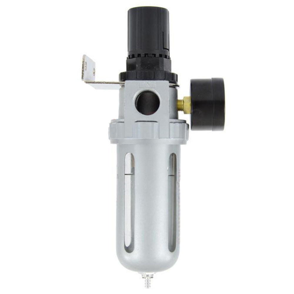Légszűrő, reduktor, olajleválasztó dehidrátor 2 mikron AFR804-2 reduktor szűrőt használnak párátlanításhoz és légnyomás-szabályozáshoz. Ez minden pneumatikus rendszer alapvető eleme. A szűrő alkalmazásával többek között megakadályozhatja; szerszámok rozsdásodása, foltok szórópisztollyal történő festéskor, tömlők károsodása stb. A szűrő nem igényel további rögzítéseket, a kompresszorhoz csatlakoztatott mellbimbón vagy csatlakozón tartják. A víz kiürítése magában foglalja a szűrő alján található szelep húzását. Elválasztja az olajat és más szennyeződéseket is. Fém tartályfedéllel van felszerelve. A 2 mikronos szűrés 0,002 mm. Műszaki adatok: Magasság: 220mm Szélesség: 80mm Szűrés: 0,002 mm Menetek: 1/2 "(kb. 18-21 mm) Maximális bemeneti nyomás: 14,7 bar Beállítási tartomány: 0,5–8,3 bar Menetes alkatrész anyaga: alumínium Maximális áramlás: 4000 l / perc Tartály kapacitása: 80 ml Súly kb: 0,3 kg