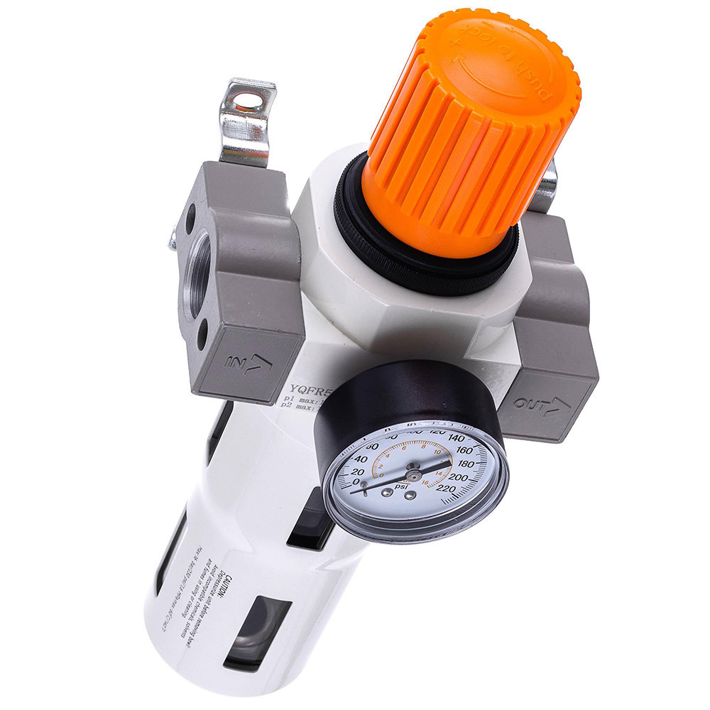Légszűrő, szeparátor, szárító, reduktor YQFR5000-06 Megtisztítja a levegőt minden szennyeződéstől, beleértve a vizet és az olajokat. Ez minden pneumatikus rendszer alapvető eleme. A szűrő alkalmazásával többek között megakadályozhatja; szerszámok rozsdásodása, foltok szórópisztollyal történő festéskor, tömlők károsodása stb. A szűrő nem igényel további rögzítéseket, a kompresszorhoz csatlakoztatott mellbimbón vagy csatlakozón tartják. Fel van szerelve konzolokkal is, amelyek a falhoz csavarozhatók. A víz kiürítése magában foglalja a szűrő alján található szelep kicsavarását. Fém tartályfedéllel van felszerelve. A reduktor nagyon pontos és masszív, és a nyomásmérő egyértelműen fel van tüntetve sávokban vagy megapascalokban lévő skálával. Műszaki adatok: Magasság: 290mm Szélesség: 95mm Szűrés: 0,005mm Szálak: 3/4 "(kb. 22-24mm) Munka / maximális nyomás: 0-10 bar / 16 bar Maximális áramlás: 5000 l / perc Tartály kapacitása kb: 150 ml Beállítási tartomány: 0-16 bar Súly: 1,75 kg