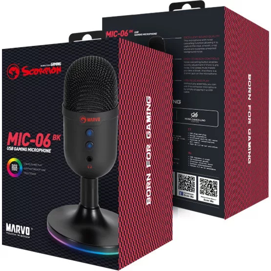 A Marvo MIC-06 BK egy RGB világítással felszerelt vezetékes gaming mikrofon, amely USB-A csatlakozón keresztül könnyen csatlakoztatható PC-re vagy laptopra. Az omnidirekcionális mikrofon zajszűrő funkcióval rendelkezik, a frekvenciatartomány 100 Hz-től 16 kHz-ig terjed. A mikrofont egy 1,7 méteres kábel köti össze az eszközzel, integrált fejhallgató kimenettel és könnyen elérhető némító gombbal ellátva. A mikrofon súlya 208 gramm, és RGB háttérvilágítás teszi látványossá.