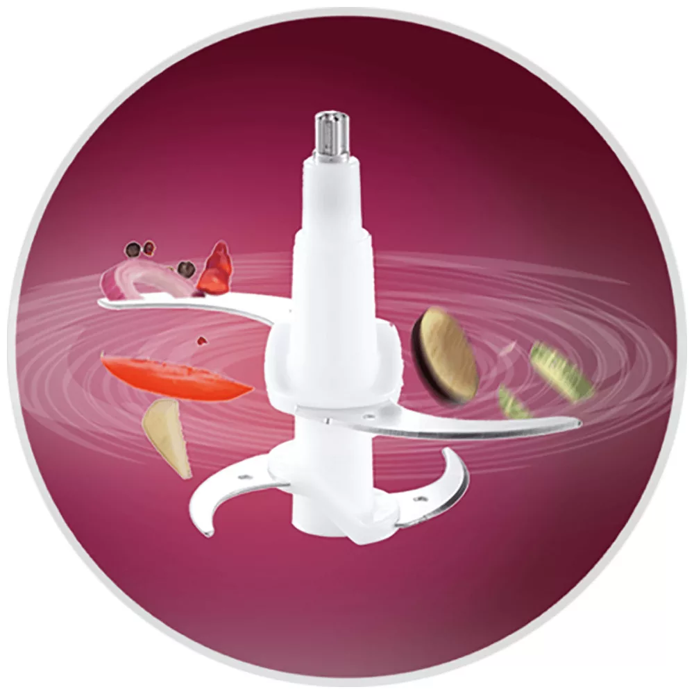 A dupla rozsdamentes acél pengék garantálják mindenféle étel precíz aprítását, függetlenül attól, hogy zöldségről, gyümölcsről, húsról vagy dióról van szó. Ez az aprító két érintésérzékeny gombbal rendelkezik, amelyek lehetővé teszik a készülék egyszerű irányítását.