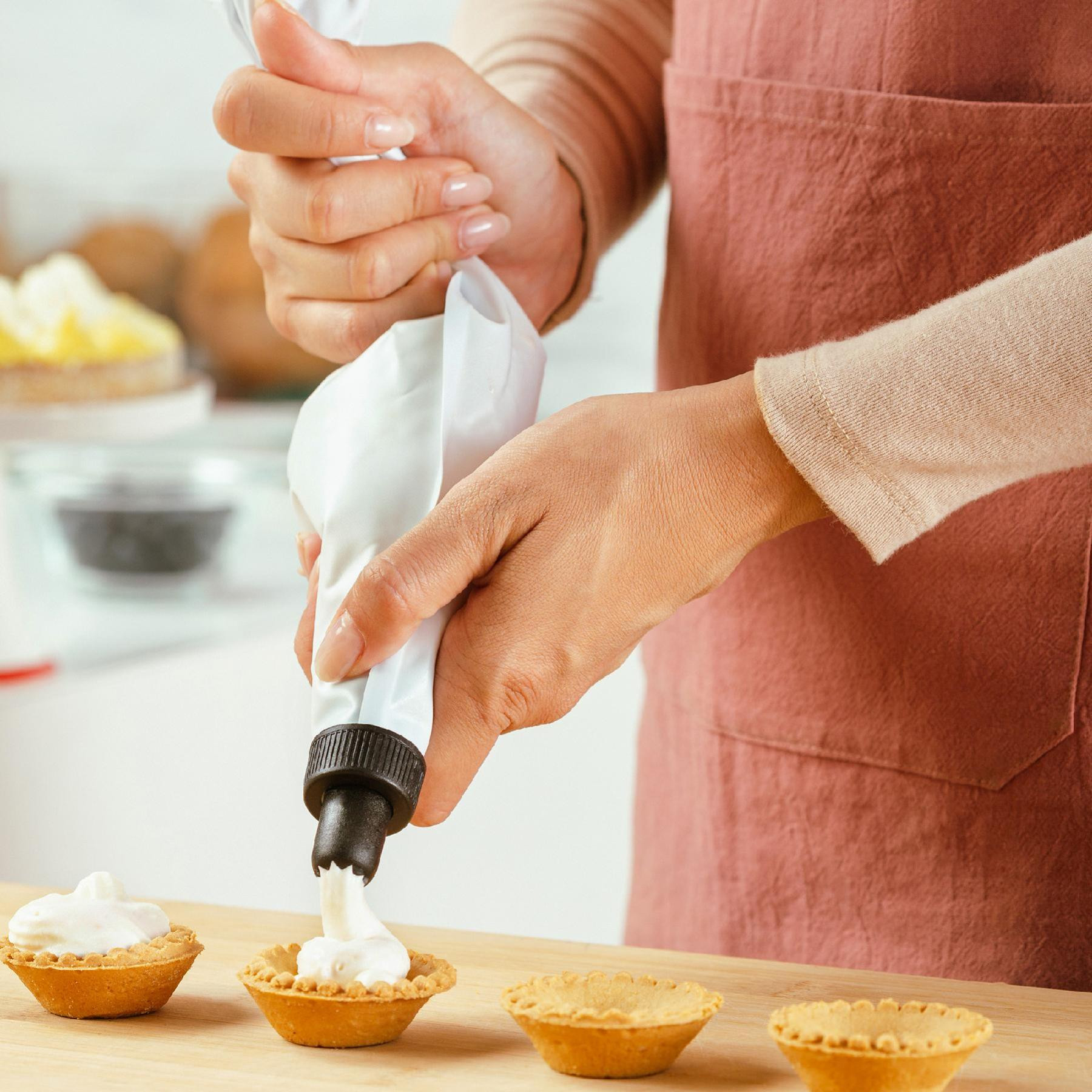 A készlet magában foglal egy újrafelhasználható 500ml-es habzsákot, kilenc díszítőcsúcsot, egy csatlakozót és egy csipeszt a hab frissen és biztonságosan való tárolása érdekében a hűtőszekrényben, anélkül, hogy szivárgás történne. Az habzsák kiváló anyagból készült, élelmiszerrel való érintkezésre alkalmasak.