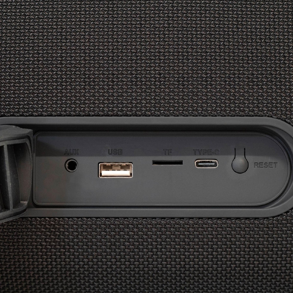 A készülék 15600 mAh kapacitású, beépített akkumulátora akár 10 órás üzemidőt is biztosít, míg a töltés mindössze 7 órát vesz igénybe. A tartozék USB-C töltőkábel gyors és kényelmes energiavisszatöltést tesz lehetővé. A boombox IPX5 védettsége révén ellenáll a fröccsenő víznek, így kültéri használatra is alkalmas. A Soft Touch gombok és a textil bevonat elegáns és könnyen kezelhető dizájnt kölcsönöznek az eszköznek.