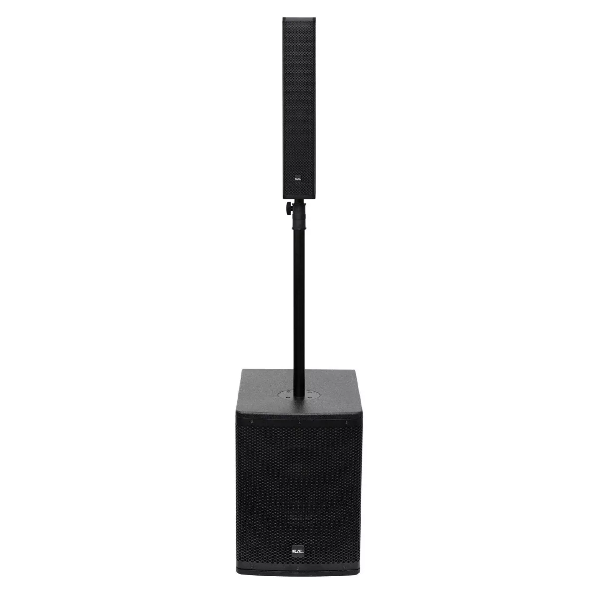 SAL PAS10W43S professzionális oszlopsugárzó hangrendszer, max. 800 W, 25cm mélysugárzó, 4x3” szélessávú satellit hangszóró, aktív zenekari hangdoboz, Bluetooth, fém állvány