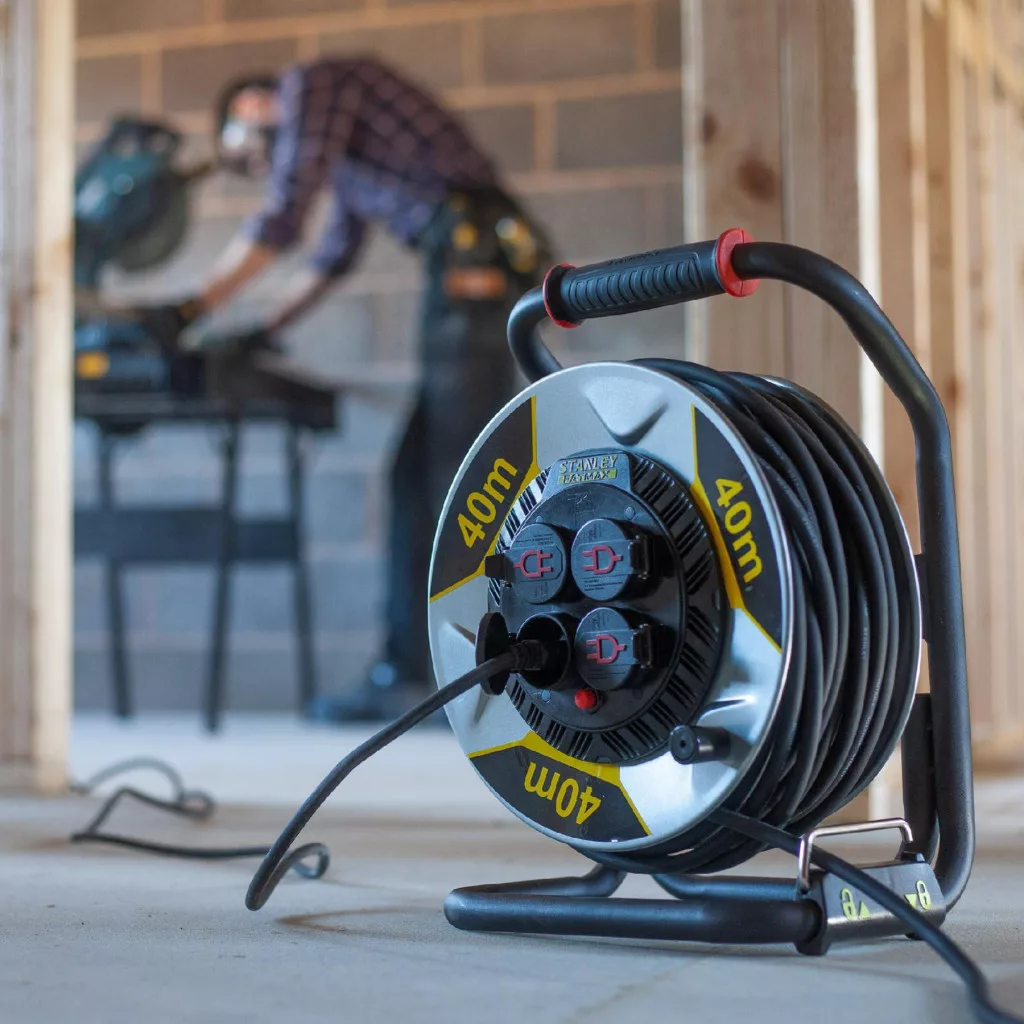 STANLEY SXECCM2FAVE kültéri fém kábeldob, 40 m, IP44-es védelem, kábelvezető, masszív fém dob és láb, H07RN-F 3G1,5 mm2 kábel, max. 3000 W