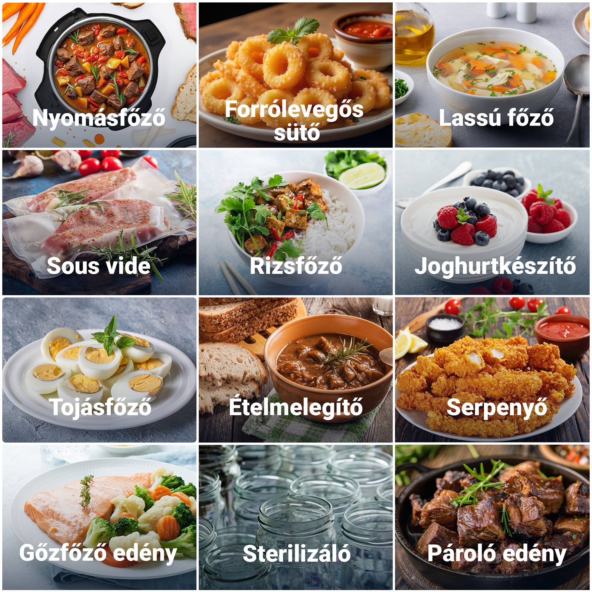 • 12 az 1-ben: kukta, légkeveréses fritőz, sous vide, lassú főző, rizsfőző, joghurtkészítő, tojásfőző, ételmelegítő, ételszárító, sterilizáló, gőzölő, sütő- vagy pirítóserpenyő