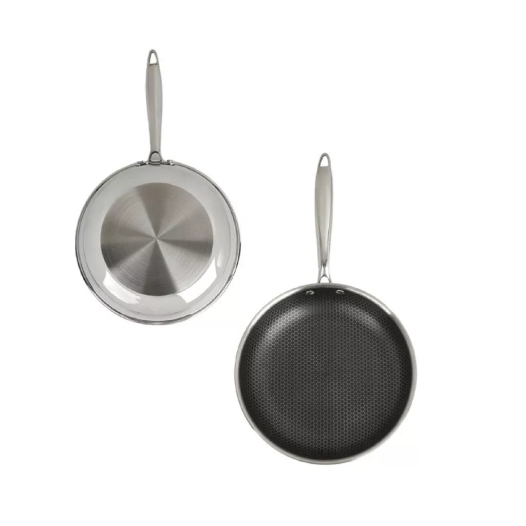 A serpenyő szerkezete egy alumínium magból és két rozsdamentes acél rétegből áll, amely hatékony hővezetést és stabilitást nyújt. Az innovatív hexagon mintázatú tapadásmentes bevonat csökkenti a letapadás esélyét, miközben megőrzi az alapanyagok természetes állagát. A karcálló kialakítás hosszú élettartamot garantál, így a serpenyő intenzív használat mellett is megőrzi minőségét.