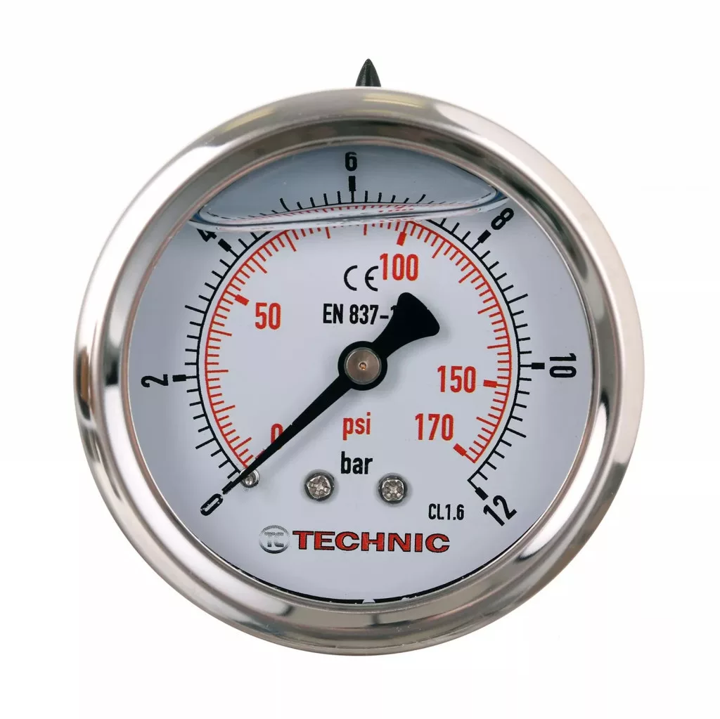 A TC Technic szilárd glicerines manométere. Tartós fém konstrukció és pontos mérés BAR-ban és PSI-ben, 1.6 pontossági osztály.
